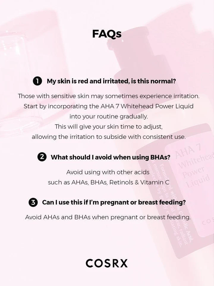 افراد باردار یا شیرده باید از AHA و BHA اجتناب کنند.به یاد داشته باشید که هر محصول جدید مراقبت از پوست را تست کنید و اگر نگرانی یا شرایط خاصی دارید با یک متخصص پوست مشورت کنید.سوالات متداولدر سایت تولید کننده اسنس درمان جوشهای سر سفید کوزارکس (COSRX) سوالات زیر مطرح میشود.پوست من قرمز و تحریک شده است، آیا این طبیعی است؟کسانی که پوست حساسی دارند گاهی ممکن است دچار سوزش شوند. با ترکیب AHA 7 Whitehead Power Liquid در روتین خود به تدریج شروع کنید. این به پوست شما زمان میدهد تا خود را تنظیم کند و با استفاده مداوم، سوزش برطرف شود.هنگام استفاده اسنس کوزارکس از چه چیزهایی باید اجتناب کنم؟از مصرف با اسیدهای دیگر مانند AHAs، BHAs، Retionols و ویتامین C خودداری کنید.آیا می توانم در صورت بارداری یا شیردهی از این استفاده کنم؟هنگام بارداری یا شیردهی از AHAs BHAs اجتناب کنید.