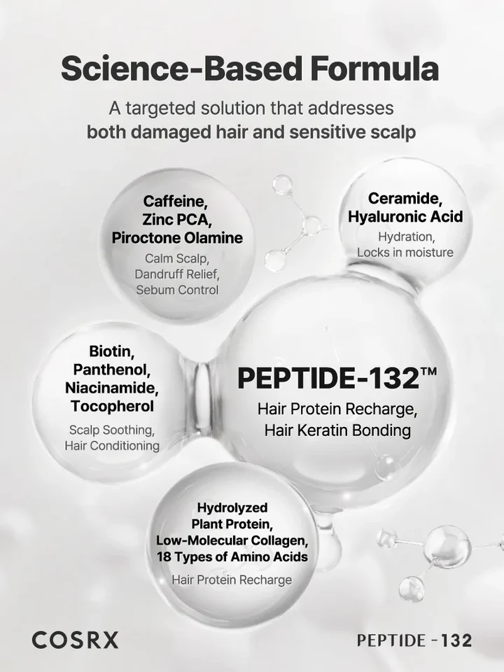 شامپو پپتاید 132 کوزارکس COSRX Peptide 132 Ultra Perfect Hair Bonding Shampoo یکی از جدیدترین محصولات برند محبوب کره‌ای COSRX در حوزه مراقبت از مو است. این شامپو به طور خاص برای پاکسازی ملایم و همزمان تقویت و ترمیم موهای آسیب‌دیده، ضعیف و شکننده طراحی شده است. مفهوم و عملکرد شامپو پپتاید 132 کوزارکس COSRX این شامپو با بهره‌گیری از فناوری پیشرفته و پپتیدهای ثبت شده، رویکردی متفاوت نسبت به شامپوهای معمولی دارد. در حالی که بیشتر شامپوها تنها به پاکسازی مو و پوست سر می‌پردازند، این محصول همزمان با پاکسازی، به ترمیم پیوندهای شکسته کراتین در ساختار مو کمک می‌کند.پپتید-132™ (PEPTIDE-132™) یک کمپلکس تری‌پپتید (ساخته شده از سه آمینواسید) است که دارای وزن مولکولی بسیار پایین است. این ویژگی به آن اجازه می‌دهد تا به عمق فیبرهای مو نفوذ کرده و به طور مستقیم به بخش‌های آسیب‌دیده کراتین متصل شود. این اتصال باعث تقویت ساختار داخلی مو، کاهش شکستگی و ترمیم موخوره می‌شود. ترکیبات اصلی و فواید شامپو پپتاید 132 کوزارکس COSRX این شامپو علاوه بر پپتیدها، حاوی ترکیبات دیگری است که به سلامت مو و پوست سر کمک می‌کنند: