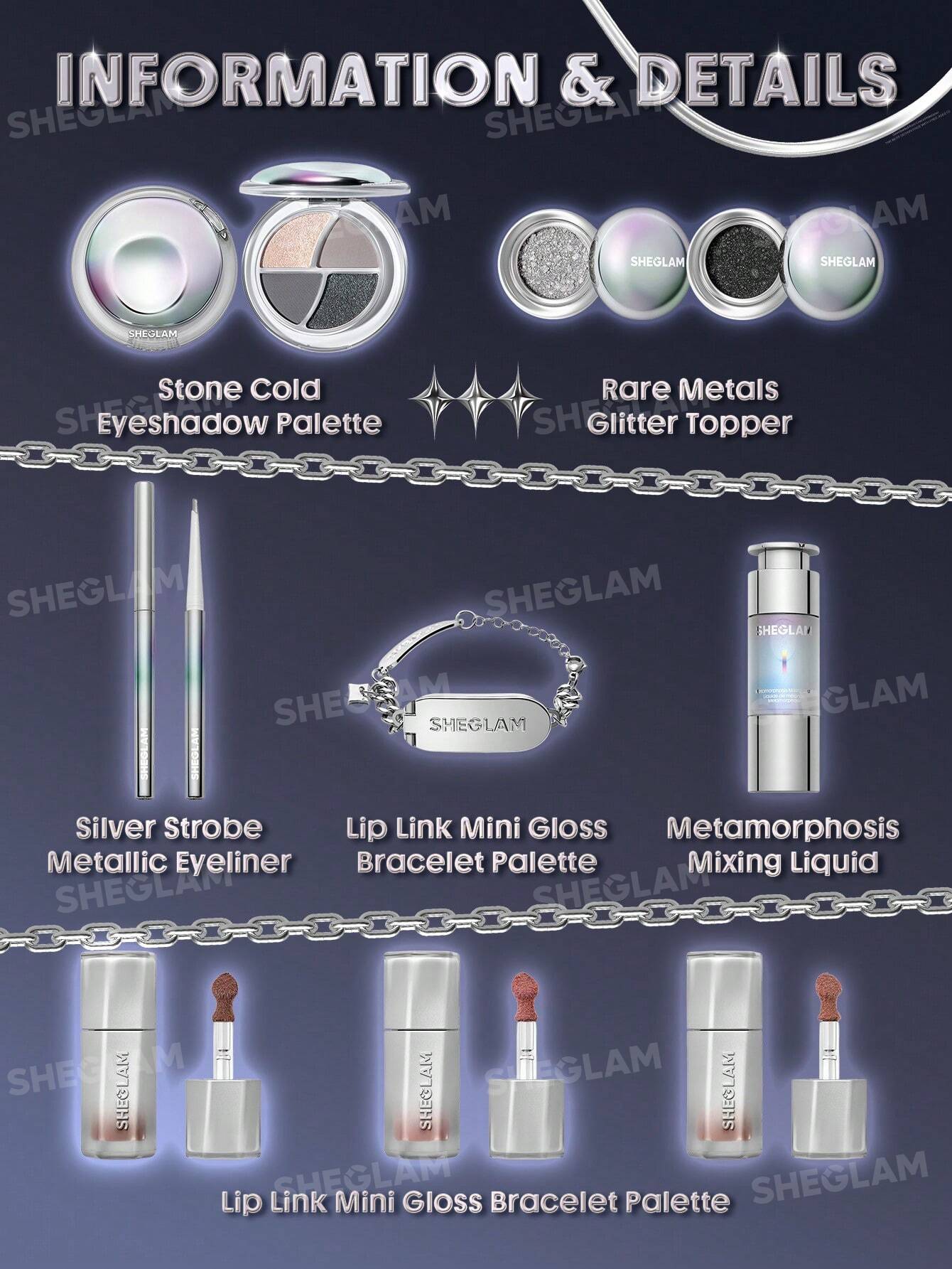 این پک آرایشی شامل مجموعه‌ای کامل از محصولات براق، کرومی و متالیک است و برای استایل‌های خاص و ترندی طراحی شده است.
