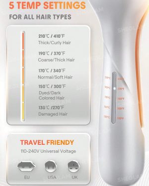 • سه درجه حرارت قابل تنظیم (۱۷۰ °C تا ۲۱۰ °C): مناسب برای انواع موها و امکان چرخش دو‌جهته برای فر به سمت چپ یا راست.